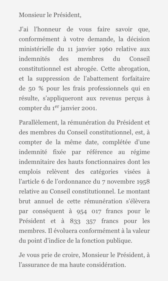 C’est par une simple lettre à l’ancien président du Conseil constitutionnel Yves Guéna, dont nous reproduisons un extrait ci-dessous, que Florence Parly avait mis fin à un privilège exorbitant des Sages. En effet, depuis 1960, ces derniers bénéficiaient d’un abattement fiscal de 50% sur leurs revenus. Dure en affaires, l’ex-secrétaire d’Etat au Budget ? Pas tant que cela… En contrepartie de cette “normalisation fiscale”, elle avait accordé une augmentation de 57% aux membres du Conseil constitutionnel, dont la rémunération mensuelle brute avait brusquement bondi de 7000 à 11.000 euros. Vingt ans plus tard, les indemnités des Sages atteignent désormais 15.000 euros bruts mensuels environ, selon la déclaration d’intérêts de la garde des Sceaux Nicole Belloubet, ex-membre de l’institution.